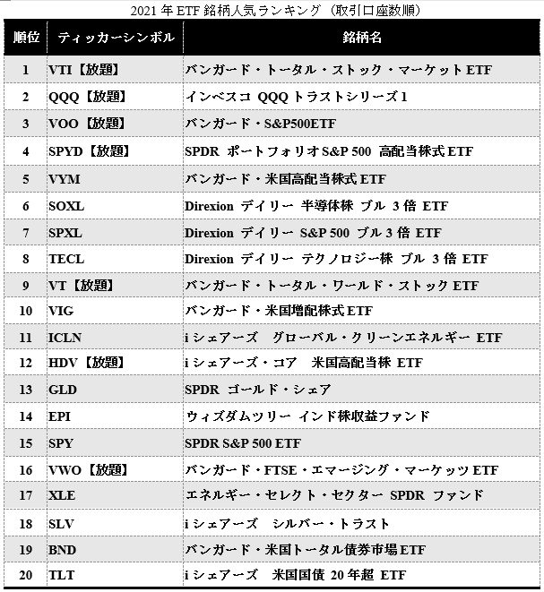 2021年にマネックス証券で取引されたETFのランキングは以下の通りとなっており、お客様のニーズに沿った銘柄入替を実施します。本プログラムの対象銘柄は【放題】と記載された銘柄です。