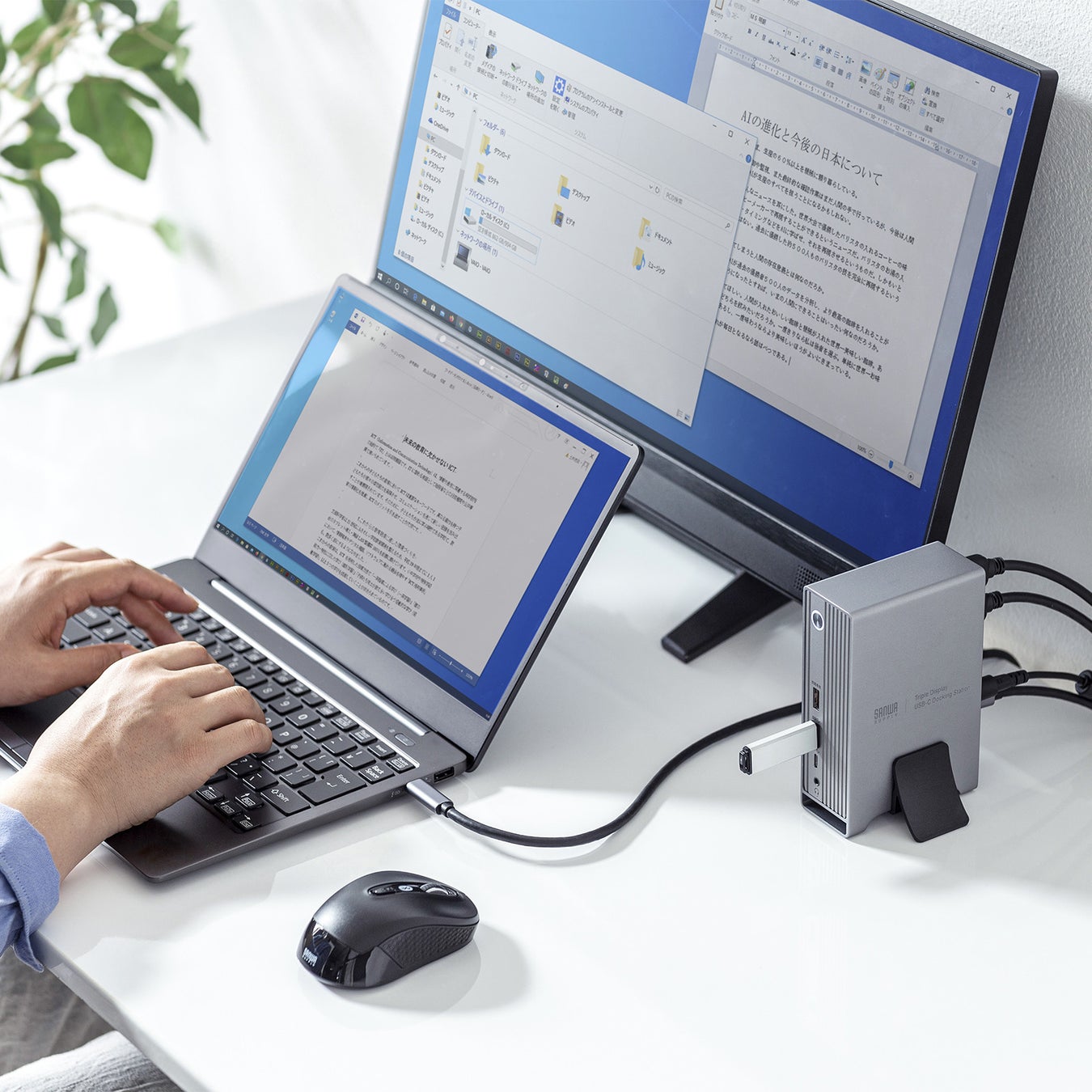 「USB-CVDK10」は、USB Type-Cケーブル1本だけでノートパソコンと周辺機器を一括接続でき、同時にノートパソコンへの給電ができるドッキングステーションです。