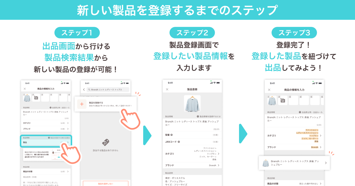 1)出品画面の「製品」枠から製品を検索すると、新しい製品登録をする導線が表示されます。