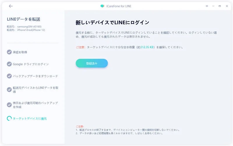 4.AndroidからLINEバックアップを取得し、iPhoneのLINEアプリでLINEアカウントを登録して「登録済み」を選びます。