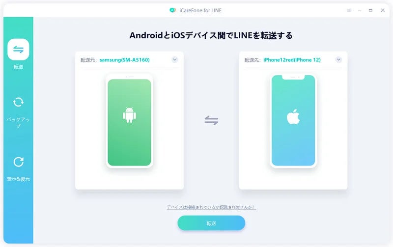 1.iCareFone for LINEを起動して、転送元のAndroidと転送先のiPhoneをUSBケーブルでパソコンに接続します。