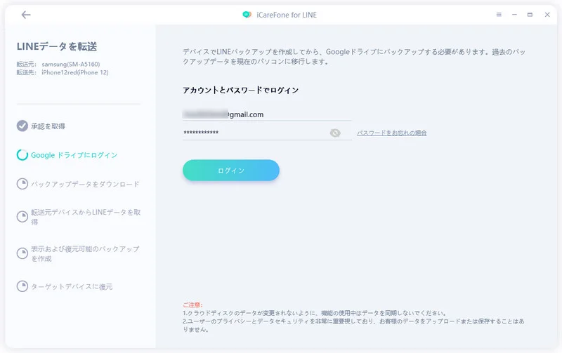 3.AndroidでのLINEバックアップに使用したGoogleアカウントを入力して「ログイン」を押します。