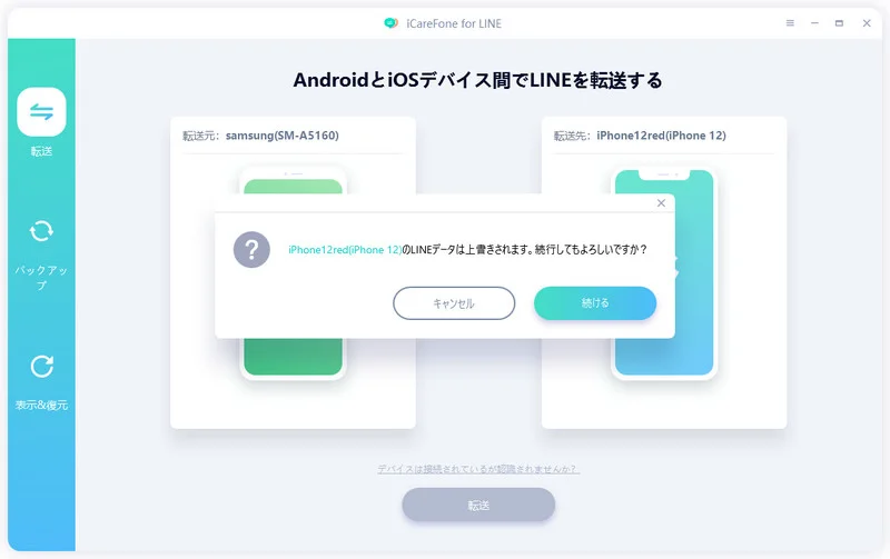 2.「転送」をクリックして、iPhoneを操作してLINEデータをバックアップし「続ける」を選択します。