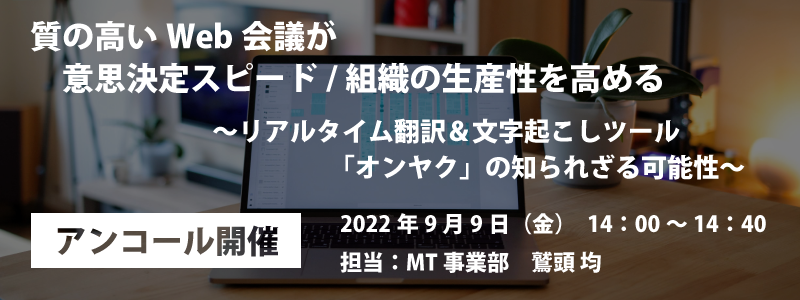 そこで本ウェビナーでは、リアルタイムで外国語翻訳&文字起こしをしてくれる音声翻訳ツール「オンヤク」を使って、Web会議の「質」を高めるソリューションをお届けします。 聞き取りづらい画面越しの声の問題を解消する高度な音声認識により、外国人との会議の発言もよりスムーズにキャッチできるようになります。