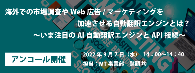 そこで本ウェビナーでは、Web広告/マーケティングの力により、規模の大小を問わず効率的に海外事業を運営するビジネス事例を検証するとともに、 MAツール等に翻訳機能を付加できるAI自動翻訳エンジンのAPI接続について解説させて頂きます。