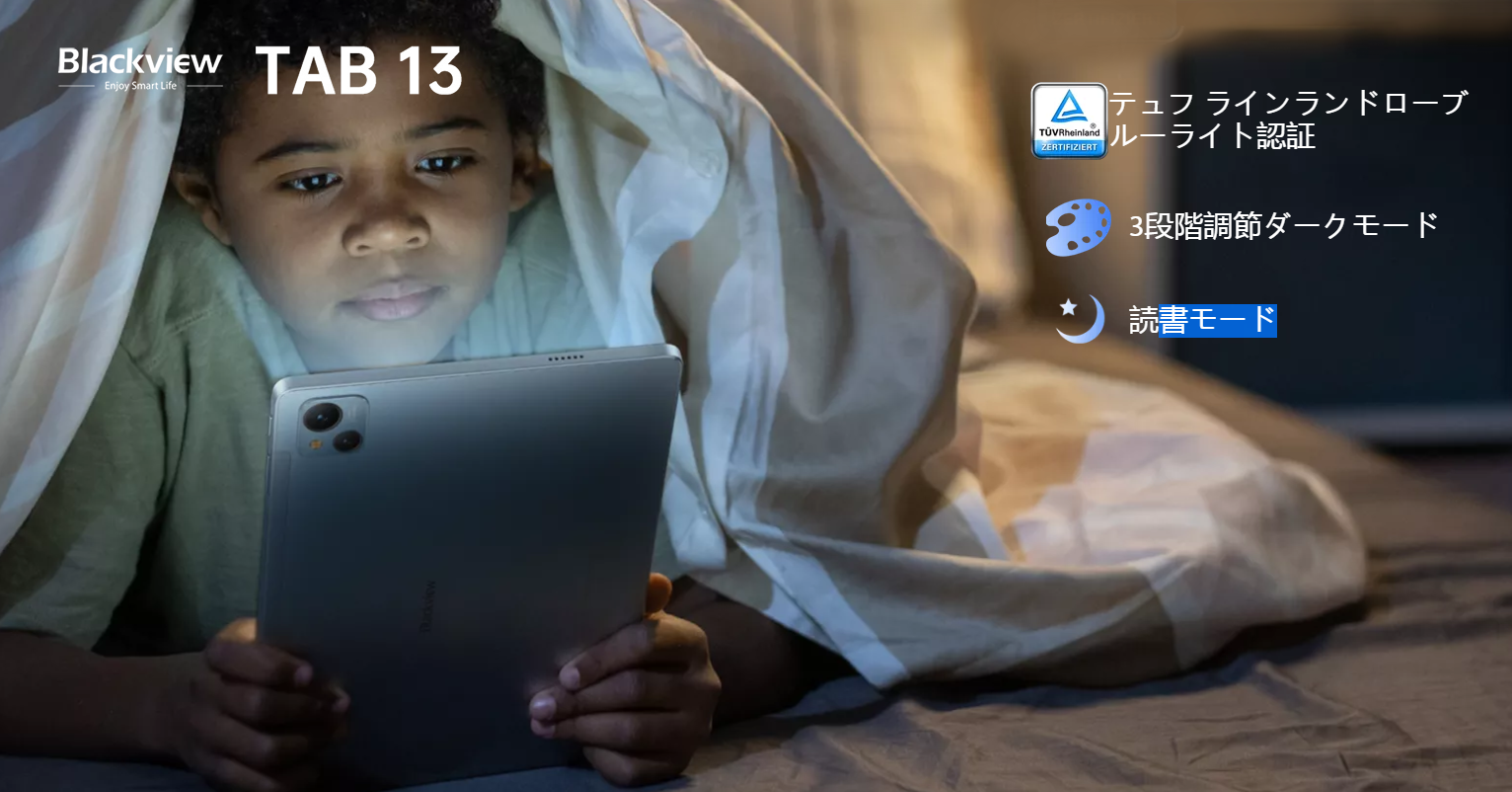 ドイツの第三者認証機関から認証を受けたブルーライトカット機能もBlackview Tab13にはあります。