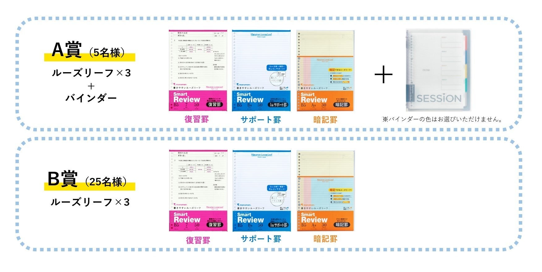 ・A賞(5名) :「Smart Review」(スマートレビュー)ルーズリーフ3罫セット +「SESSiON」(セッション)バインダー
