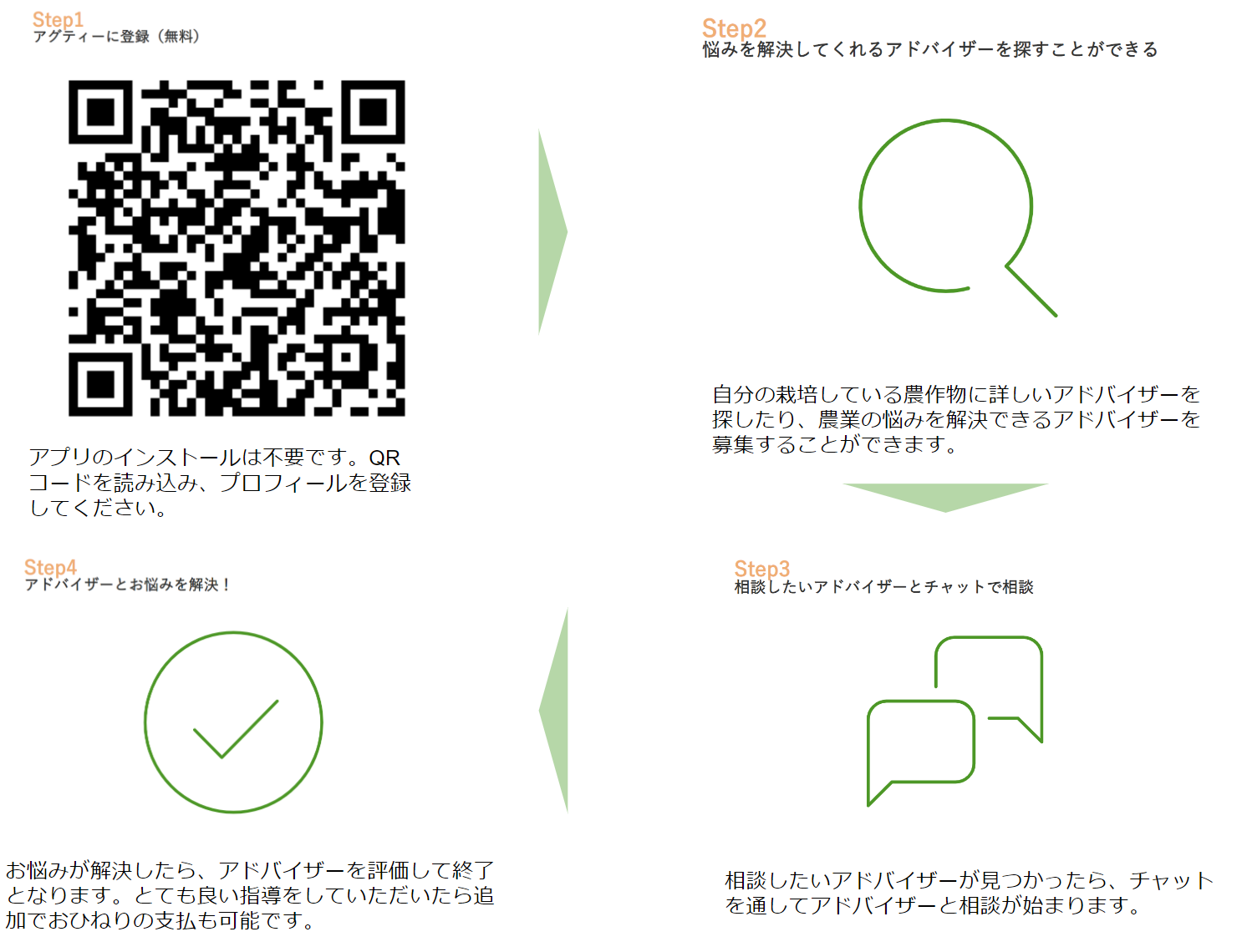 アグティーは悩みのある農家が全国にいるプロ農家や元農業普及指導員、農業経営コンサルなどのアドバイザーに自身の悩みを相談しチャットとビデオ通話で悩みを解決できるサービスです。