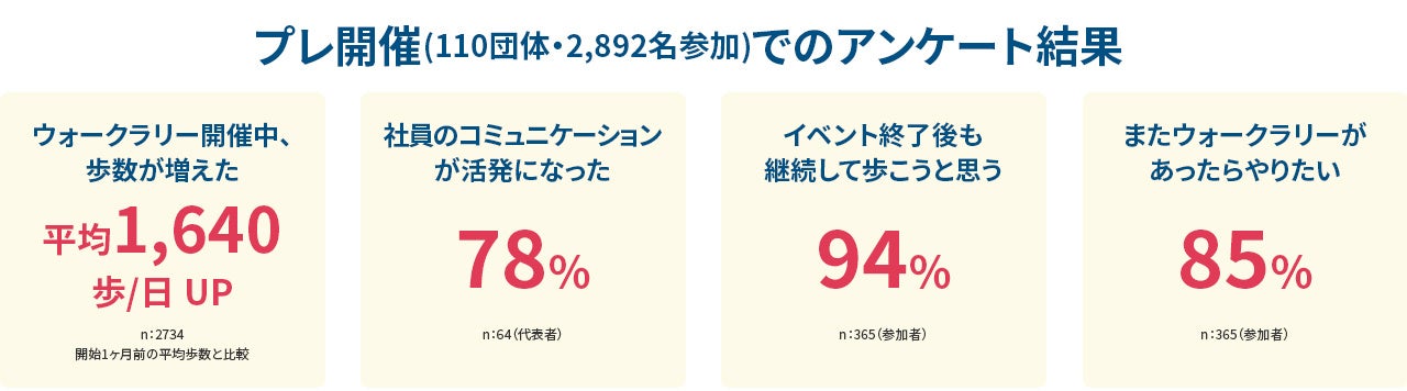 前回実施したウォークラリーイベントでは、イベント開始1ヶ月前の平均歩数と比較をすると、平均歩数は1640歩が増加し、またイベント後、参加者に対しアンケートを実施したところ、93.7%がイベント後もウォーキングの継続意向があると回答。