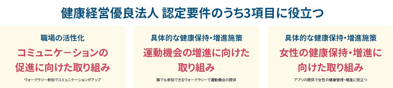 アプリを使ったウォークラリーを社内で実施することで、健康経営優良法人の認定要件でもある以下3つの項目に役立てることができます。