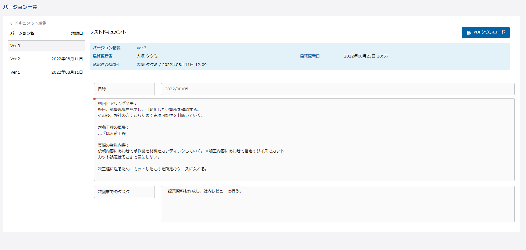 - 承認済みのドキュメントを編集し、保存すると、バージョンアップされる。