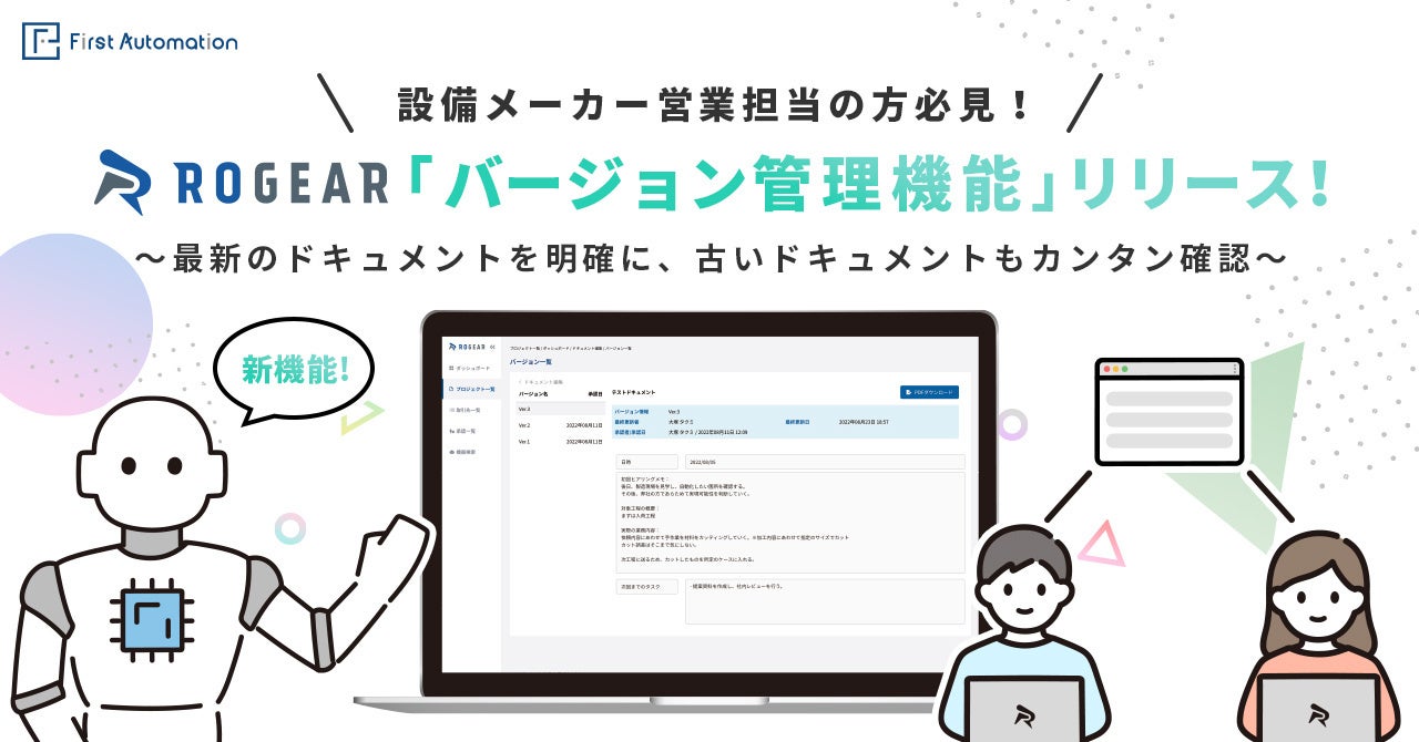 そこで、わたしたちファースト・オートメーションは、ロボット導入が円滑になる仕様管理ツール「ROGEAR」に、ROGEAR内で承認されたドキュメントにバージョン情報を付与し、ドキュメントの変更履歴が閲覧可能となる「バージョン管理機能」を新たに追加しました。これにより、ドキュメント管理やプロジェクトの振り返りの簡素化、認識齟齬によるトラブルの防止などが可能となります。