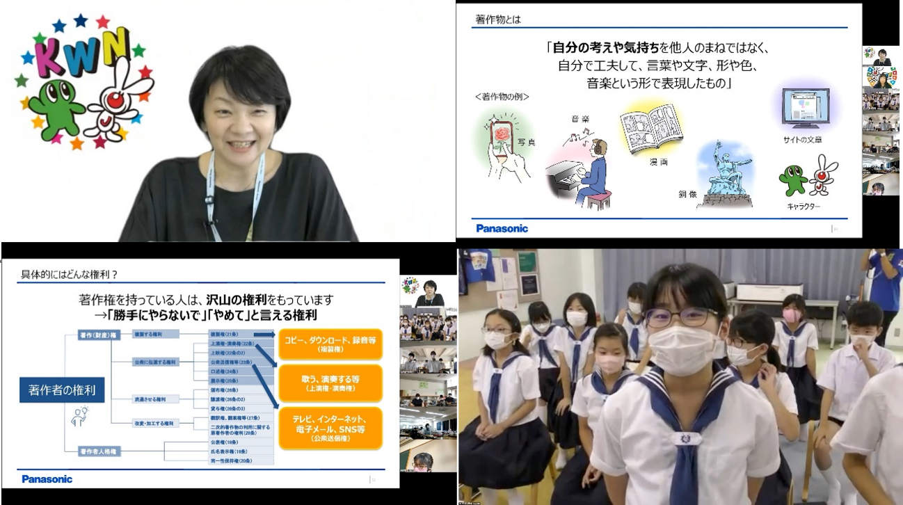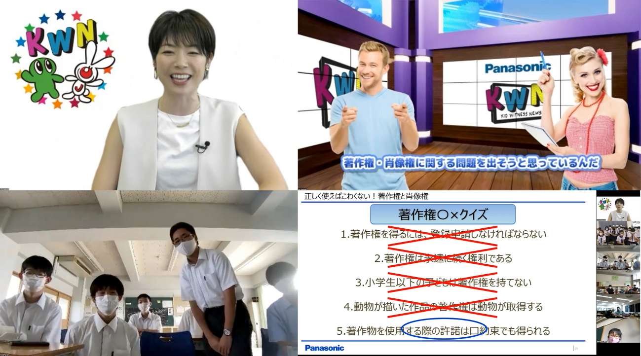 KWNでは映像制作サポートとして毎年、さまざまなワークショップを企画し、提供していますが、2022年度は8月に2回、特別ワークショップをオンラインで実施しました。1回目の8月8日(月)は2021年に引き続きフジテレビ・関西テレビ共催「スペシャルコラボワークショップ」を、2回目の8月22日(月)には、同グループの知財部門の社員が講師となり「みんな知ってる?著作権と肖像権の3C」を開催し全国から併せて12校169名の児童と生徒が参加しました。