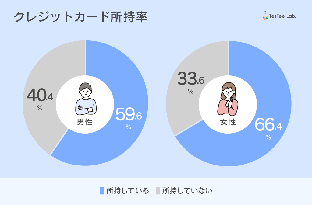 18〜24歳の男女1,595名にクレジットカードを所持しているかどうか聞いたところ、「クレジットカードを所持している」と回答した人は男性は59.6%、女性は66.4%と回答。およそ6割の人が所持しているという結果になりました。