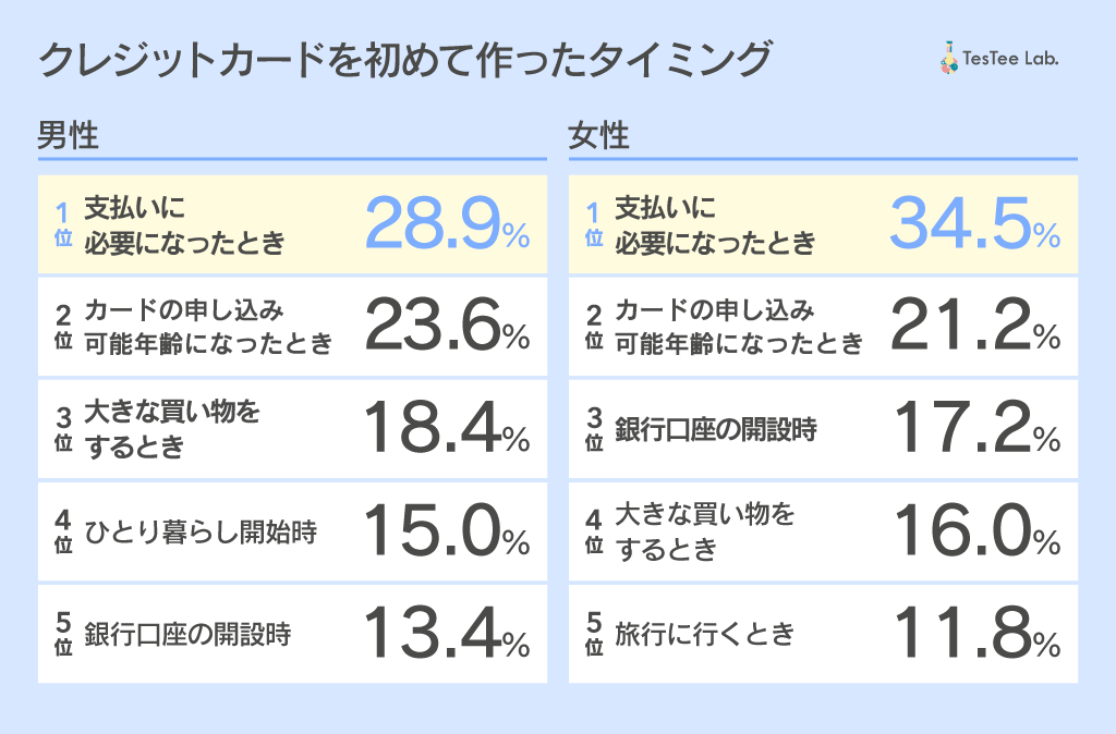 クレジットカードを所持していると回答した人を対象に、クレジットカードを初めて作ったタイミングを調査したところ、男女ともに第1位は「支払いに必要になったとき」で、男性の28.9%、女性の35.4%、続いて第2位は「カードの申し込み可能年齢になったとき」で、男女共に2割程度となりました。