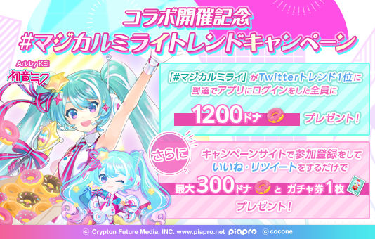 期間中、「#マジカルミライ」のワードがTwitterトレンド1位に到達すると、各アプリにログインした方全員に「1200ドナ(ポケコロ)」「3600ハピ(ポケコロツイン)」のアプリ内通貨をプレゼントします。また、キャンペーンサイトで参加登録を行い、いいね・リツイートをするだけでも最大で「300ドナとガチャ券1枚(ポケコロ)」「1200ハピとガチャ券1枚(ポケコロツイン)」を獲得することができます。