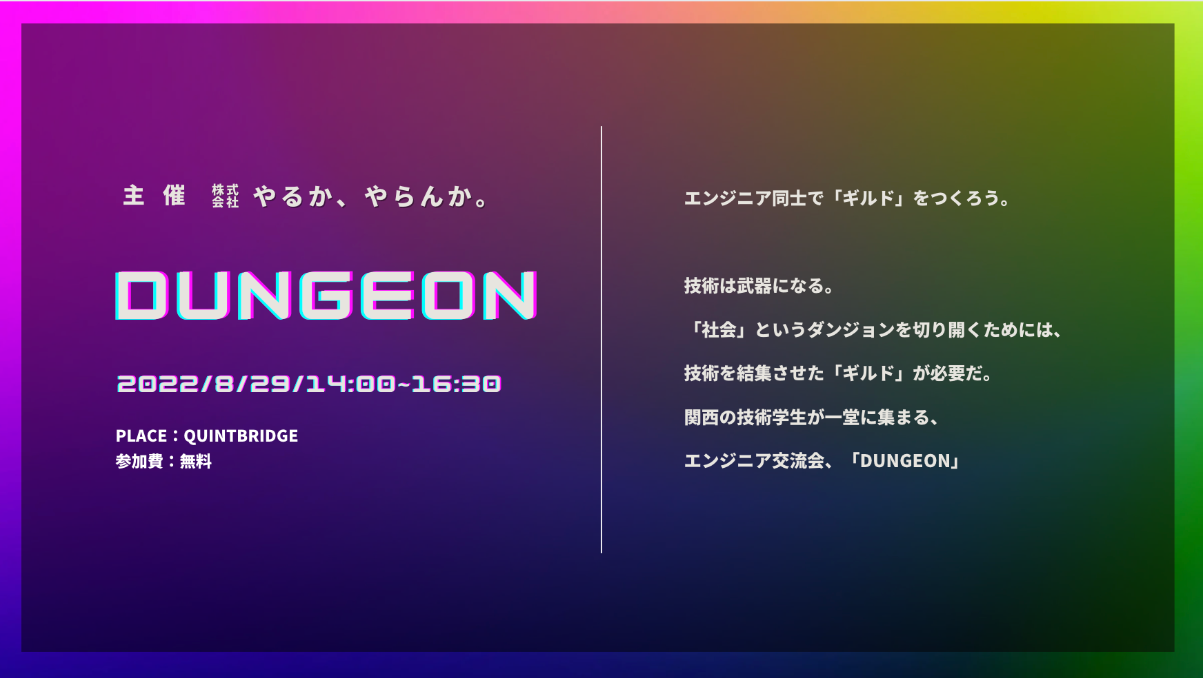 イベントのコンセプトは、”「社会」というダンジョンを切り開く、学生エンジニアのギルド”。多種多様なスキルを持ち、日々違う場所で活躍する学生エンジニアたちが、情報交換や共有を行い、互いに教え合い、学び合う環境を関西に創出します。