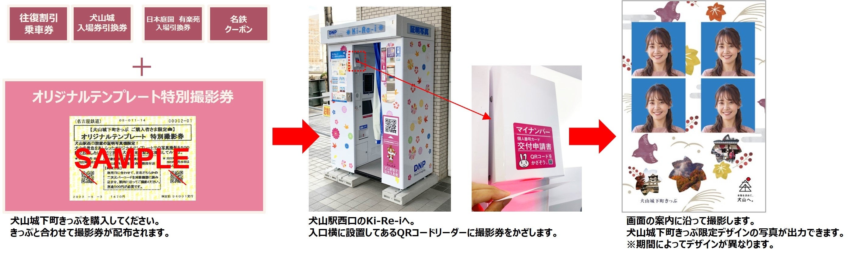 ①名古屋鉄道は犬山までの名鉄電車と犬山城入場券などをおトクにセットした商品「犬山城下町きっぷ」を発売しています。今回、このきっぷを2022年9月1日~2023年2月28日に購入した方にはQRコード付きの特別撮影券を配布します。