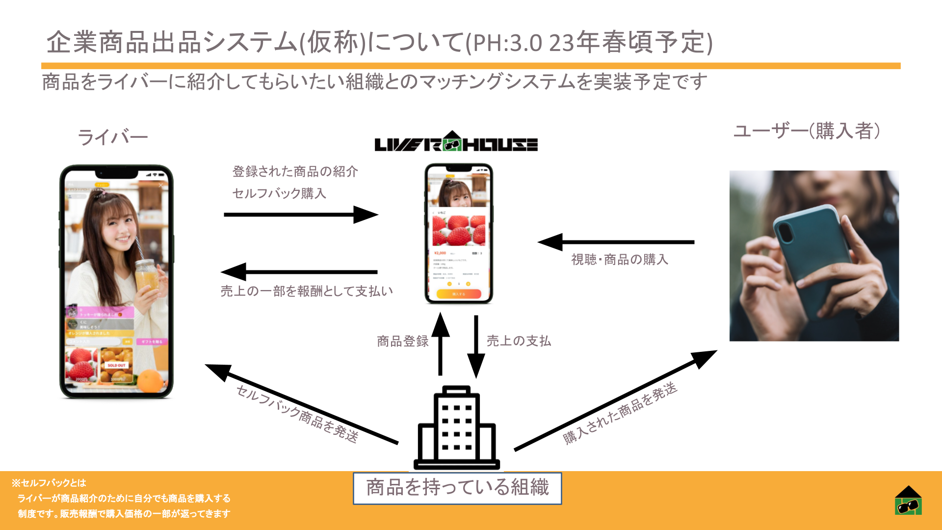 商品を持っていないけれど、ライブコマースに興味がある・稼ぎたいという人と、商品をライブコマースで販売したいけれどライバーがいないという企業のマッチングシステムを実装予定です。