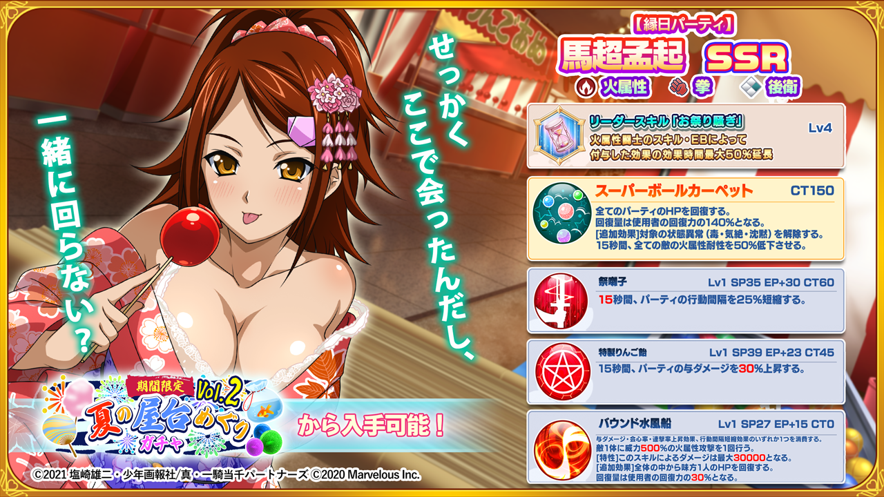 本日開始の「夏の屋台めぐりガチャvol.2」では、新たに「【縁日パーティ】馬超孟起」(CV:遠藤綾)」が登場。同ガチャでは、「【縁日パーティ】馬超孟起」の排出率が他の同レアリティの闘士よりも高くなっております!