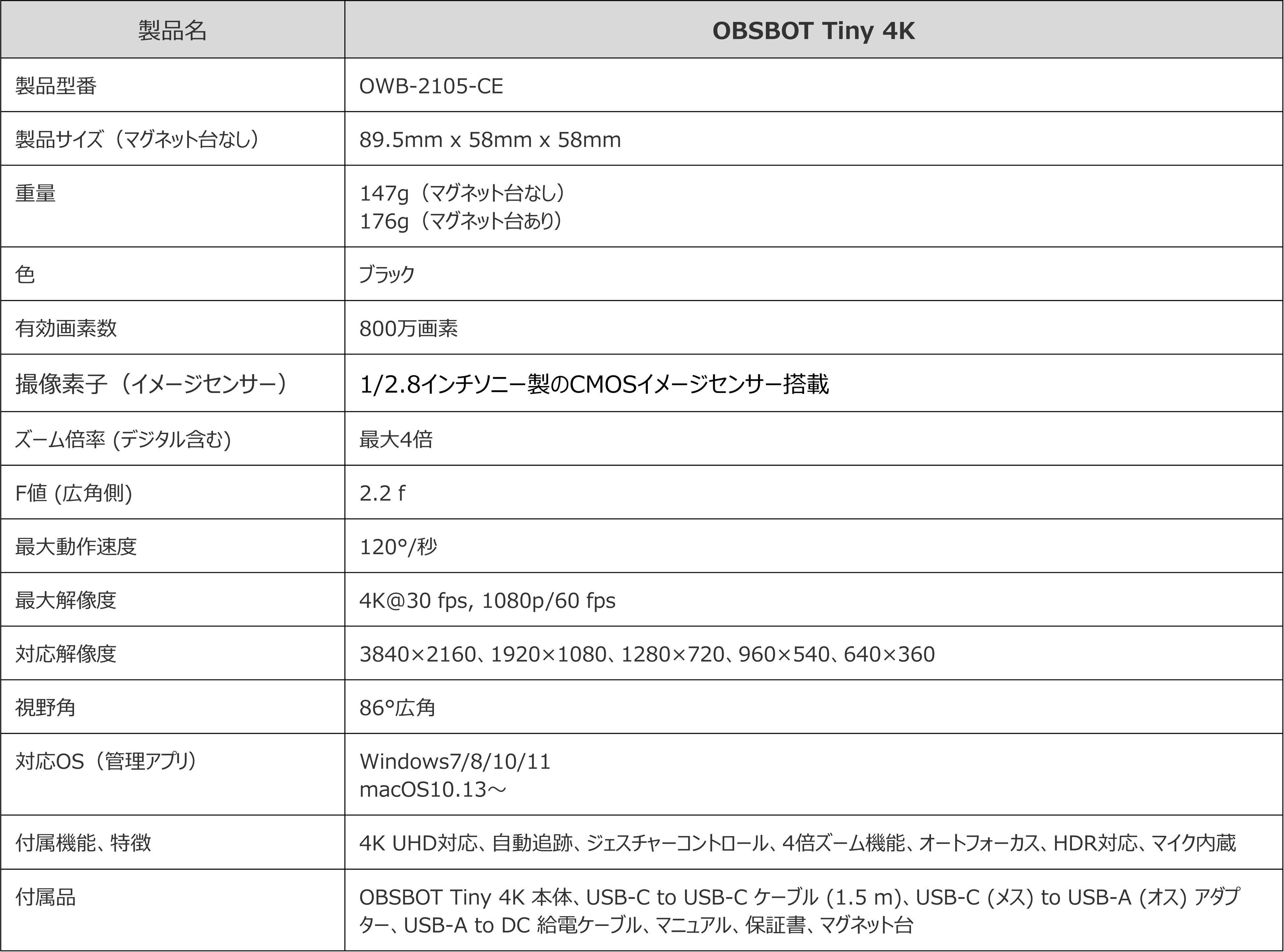 OBSBOT Tiny 4K公式サイト:https://www.obsbot.com/jp/obsbot-tiny-4k