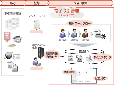 シリーズの第一弾として2022年12月より提供する“電子取引管理サービス”は、一連の取引業務で発生する取引関係書類を長期保管するクラウドサービスです。本サービスを導入することで、お客さまは、各部門で個別に管理していた注文書や請求書などの取引関係書類を一元管理し、ワークフローにより承認プロセスを電子化することができます。また、電子帳簿保存法の電子取引要件とスキャナ保存要件の両方に準拠しており、法的要件を満たしながら部門間での情報の利活用に加え、税務調査時の業務負荷も削減できます。各業務の取引関係書類を集約し、部門間の円滑な情報連携を実現することで、お客さまの業務プロセス全体を最適化します。また、キヤノンMJグループの経理※3・調達・法務部門において利用していくことにより、社内で蓄積した導入・運用ノウハウを活かして、お客さまへのサービスとして提供します。