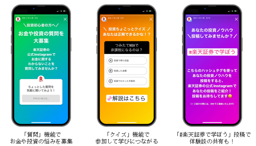 楽天証券は、2020年1月に楽天証券公式Instagramを開設して以来、お金や投資に関連する情報を積極的に発信してきました。このたび、これまで以上にInstagramを活用される方との相互コミュニケーションを活発に行えるよう、Instagramのストーリーズ投稿の様々な機能を活用し、投稿内容をリニューアルします。例えば、フォロワーの方が、直接質問ができる「質問」機能を活用し、お金や投資に関する疑問を楽天証券経済研究所に所属するアナリストや社員が、動画(リール)や画像を利用して、短時間でもわかりやすい内容で回答しています。また、フォロワーの方も参加できる「クイズ」機能を使った、学びを促す投稿も行います。
