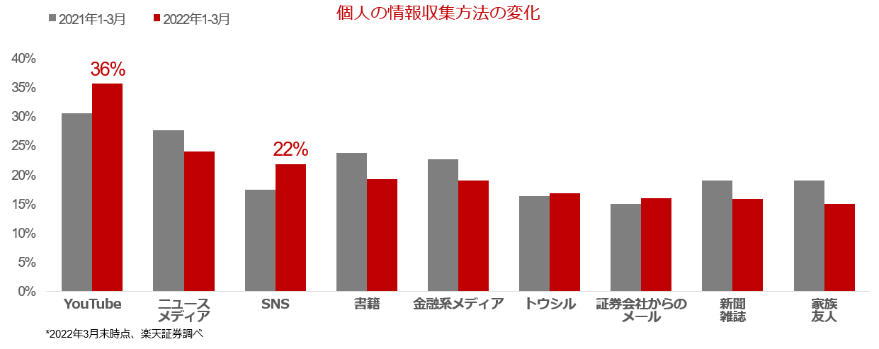 近年、生活のあらゆる面でSNSの利用が活発になる中、楽天証券は、SNSでの情報発信や顧客コミュニケーション強化のため、YouTubeやTwitter、LINEなどに加え、2020年1月に公式Instagramを開設しました。2022年3月に楽天証券で実施した調査では、投資関連情報の取得元をYouTubeとする回答が36%に、そのほかのSNSは22%と、どちらも前年同期比5ポイント増となり、投資についての情報収集もSNSを活用する傾向が高まっていることがわかりました。今回、楽天証券公式Instagramの投稿内容をリニューアルすることで、これまで以上にあらゆる層の方の資産づくりに楽天証券をご活用いただけるようになると期待しています。