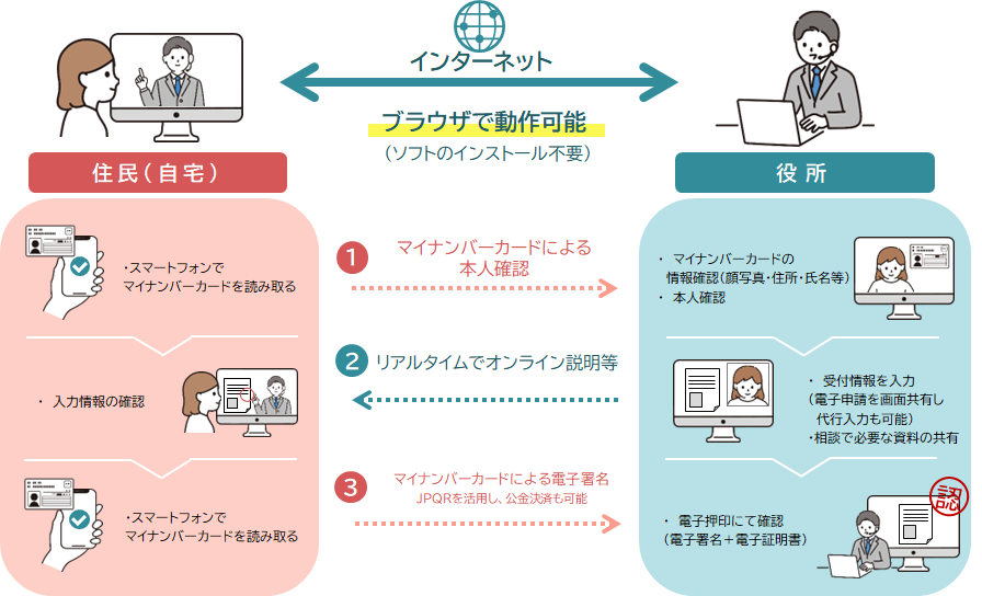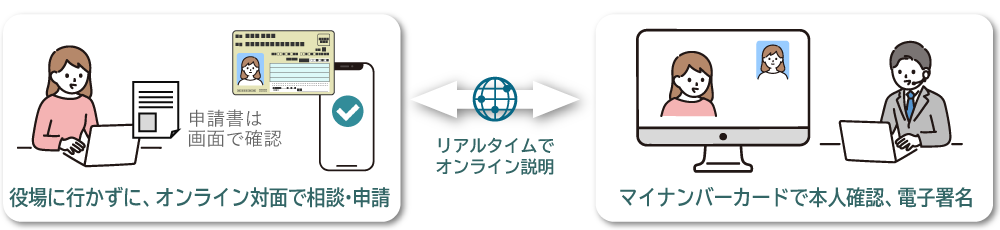 サービス内でのオンラインミーティング機能を通じ、自治体職員と住民がリアルタイムで対話しながら、各種申請の支援や相談が行えるサービスです。本人確認や電子署名を行う際には、スマートフォン(※)でマイナンバーカード情報を読み取ります。