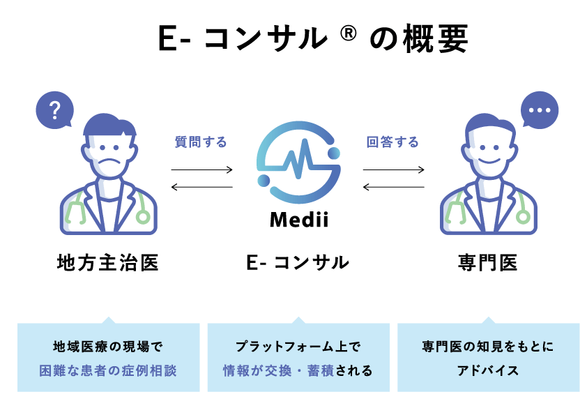 『E-コンサル®』は医師が院外や遠方の専門医に無料で1対1のコンサルを受けられるオンラインサービスです。診断が難しい症例や自身の専門外の症例を『E-コンサル®』上のチャット機能及びビデオ通話を通じて匿名で相談が可能です。現在、経験豊かな500名以上のMedii認定専門医が登録しており、医師からの相談内容に応じて、複数の専門医へ通知され、その内1名とマッチングされます。地域偏在の課題が大きく知見が行き渡っていない免疫難病や希少難病を中心に全ての専門領域を扱っています。