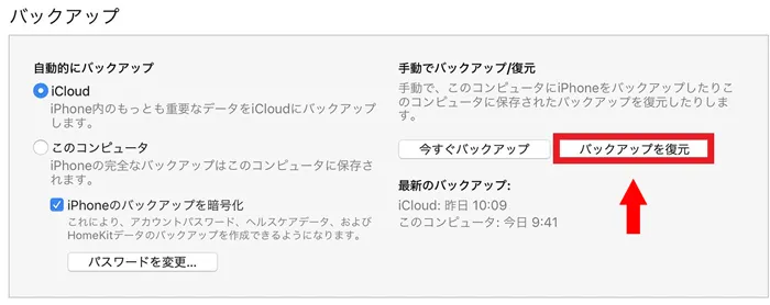 iPhoneをPCに接続したあと、iTunesを開いて「概要」内にある「バックアップを復元」を選択します。