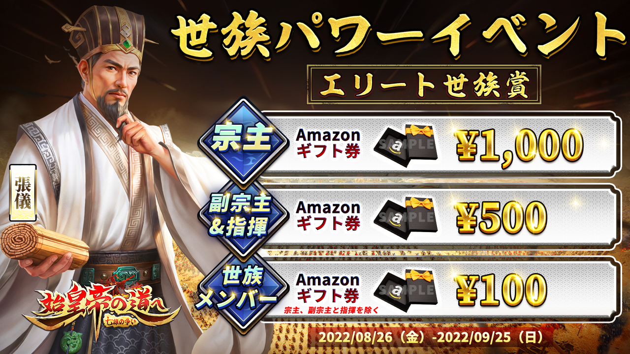 イベント概要:第2回オープンβテスト終了時に、勢力値が最も高いレベルの世族メンバー全員に、メンバーレベルと攻城戦参加回数に応じてAmazonギフト券が割り当てられ、個人には最大1万円分のAmazonギフト券を受け取るチャンスがあります。 指定の攻城戦をクリアされた方には、世族メンバー全員にAmazonギフト券をプレゼントいたします。