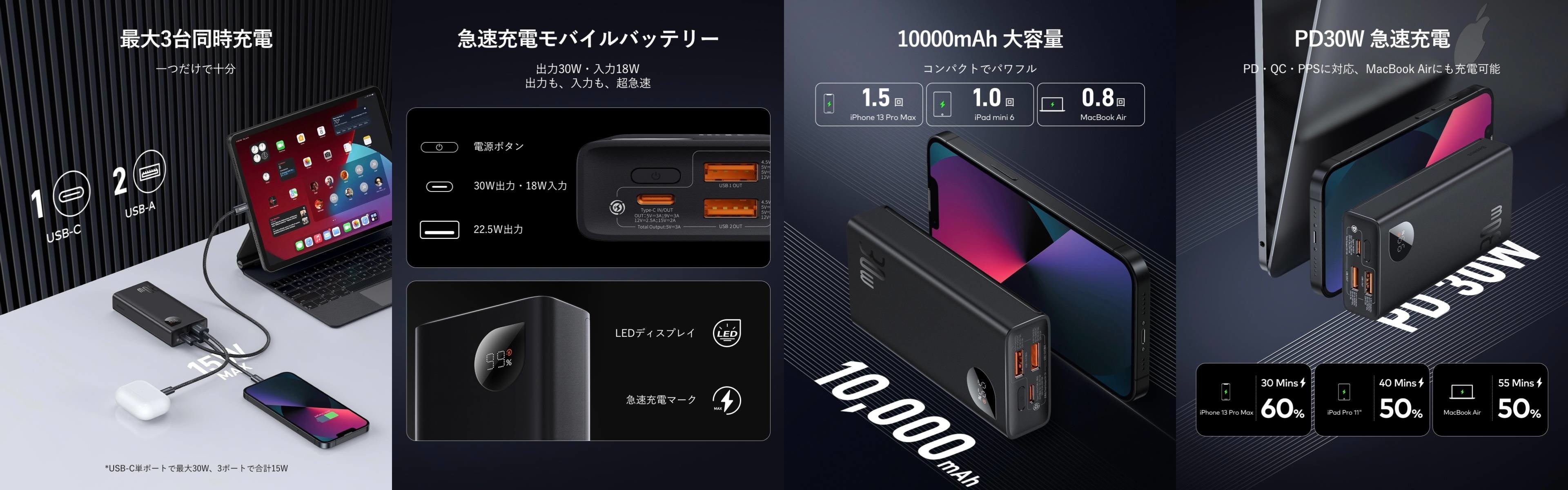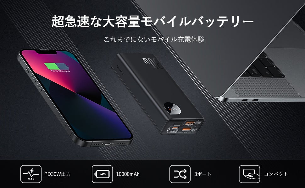 USB Power Delivery急速充電対応のUSB-Cポートによる最大30Wの出力で、わずか30分でiPhone13 Pro Maxを60%まで充電することが可能です。PD高出力でノートPCも充電でき、例えばMacBook AirであればType-Cポートより55分で50%まで充電できます(Baesus調べ)。