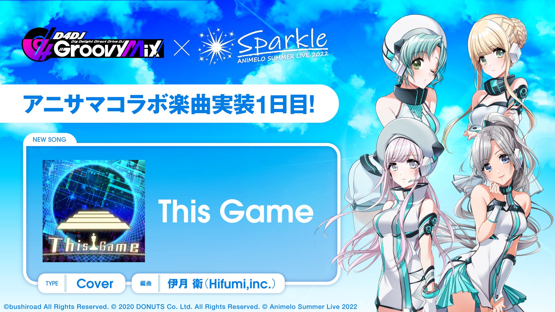 株式会社ブシロード(本社:東京都中野区、代表取締役社長:木谷高明)は、株式会社DONUTS(本社:東京都渋谷区、代表取締役:西村啓成)と共同開発のスマートフォン向けリズムゲーム「D4DJ Groovy Mix」(以下グルミク)にて、8月26日(金)、8月27日(土)、8月28日(日)に開催されたアニソンイベント 「Animelo Summer Live 2022 -Sparkle- (アニサマ)」とのコラボ楽曲としてカバー曲「This Game」を追加いたしました。
