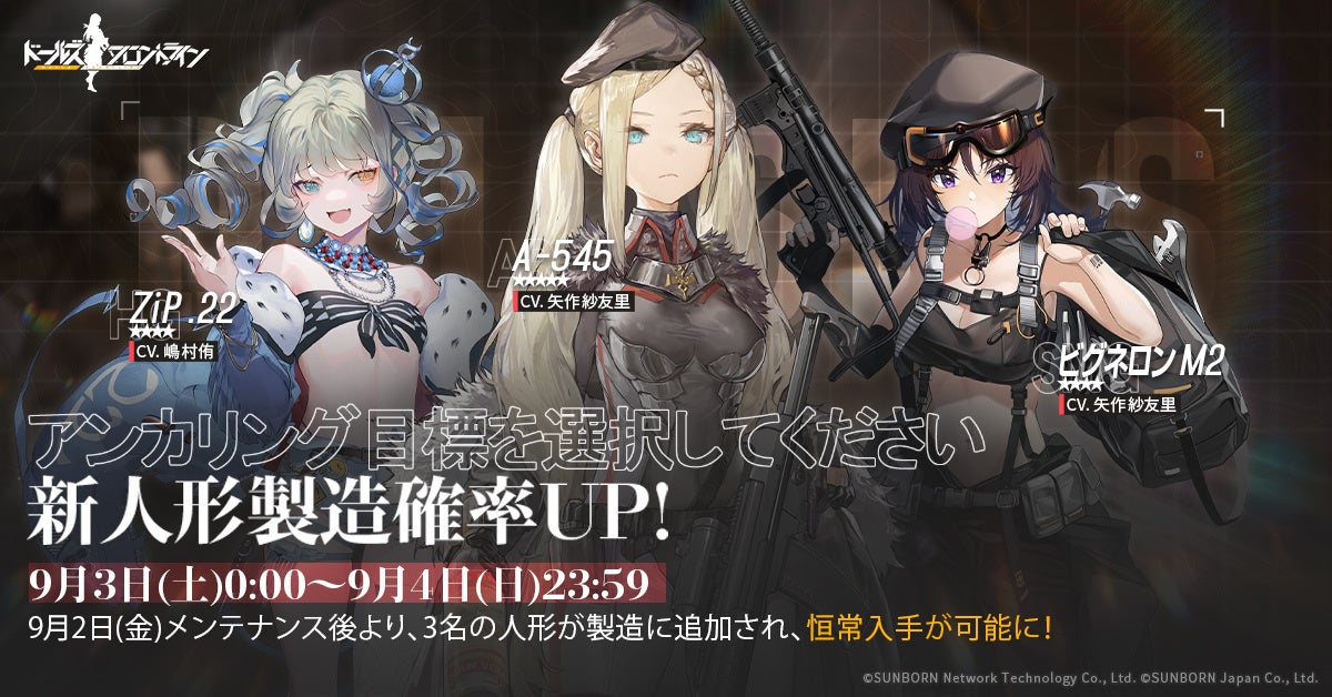 株式会社サンボーンジャパンは、スマホ向け戦略型シミュレーションゲーム『ドールズフロントライン(以下、「ドルフロ」)』において、9月2日(金)より新たな人形3名の追加と、それに伴う確率UPイベントの開催についてお知らせいたします。