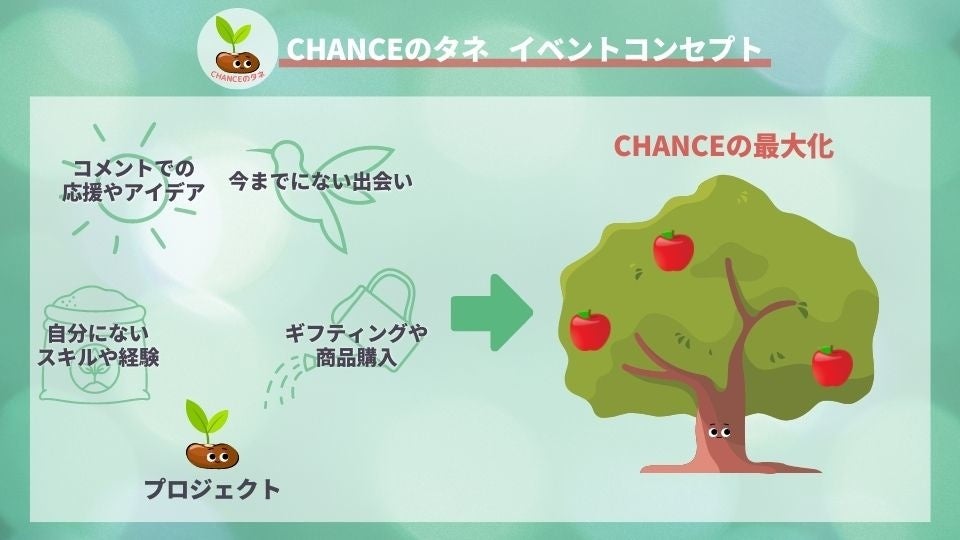 そんな仮定をもとに、「CHANCEのタネ」は、タネとなる「プロジェクト」がライブ配信を実施し、それぞれのタネに皆さんの意見やアイデア、スキル・ノウハウ、経験などを与え合いながら共に育てていくイベントです。ライブ配信ならではの楽しさを味わってみてください。