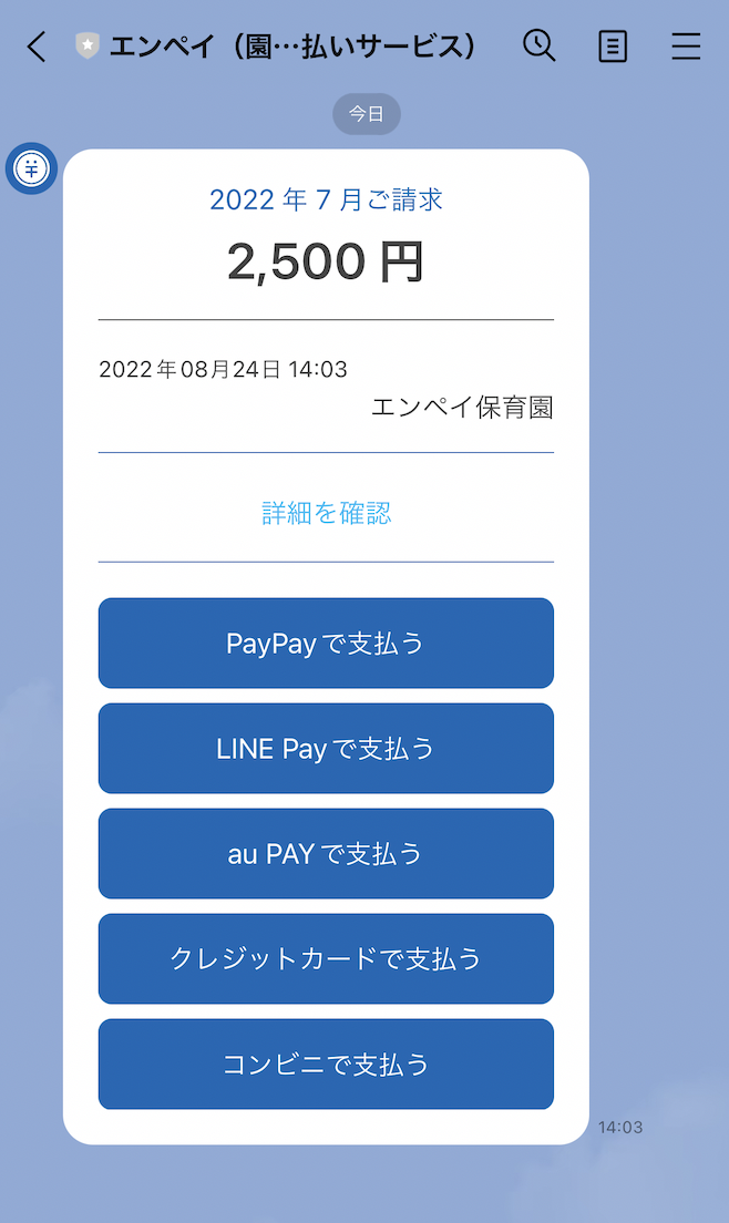 保護者は、ご利用のLINEアカウントのメッセージに請求通知が届き、24時間365日好きな支払い手段(クレジットカード・Paypay・LINE Pay・au PAY・コンビニ払い)からお支払いが可能です。