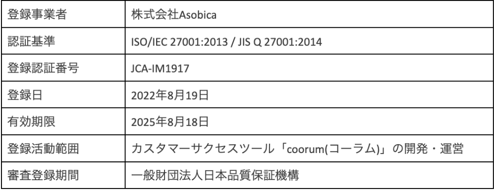 「遊びのような熱狂で、世界を彩る」をミッションに掲げ、カスタマーサクセスプラットフォーム「coorum(コーラム)」を提供する株式会社Asobica(本社:東京都品川区、代表取締役:今田孝哉、以下当社)は、情報セキュリティマネジメントシステム(ISMS:Information Security Management System)の国際規格である「ISO/IEC 27001:2013 / JIS Q 27001:2014」の認証を2022年8月19日付で取得いたしました。