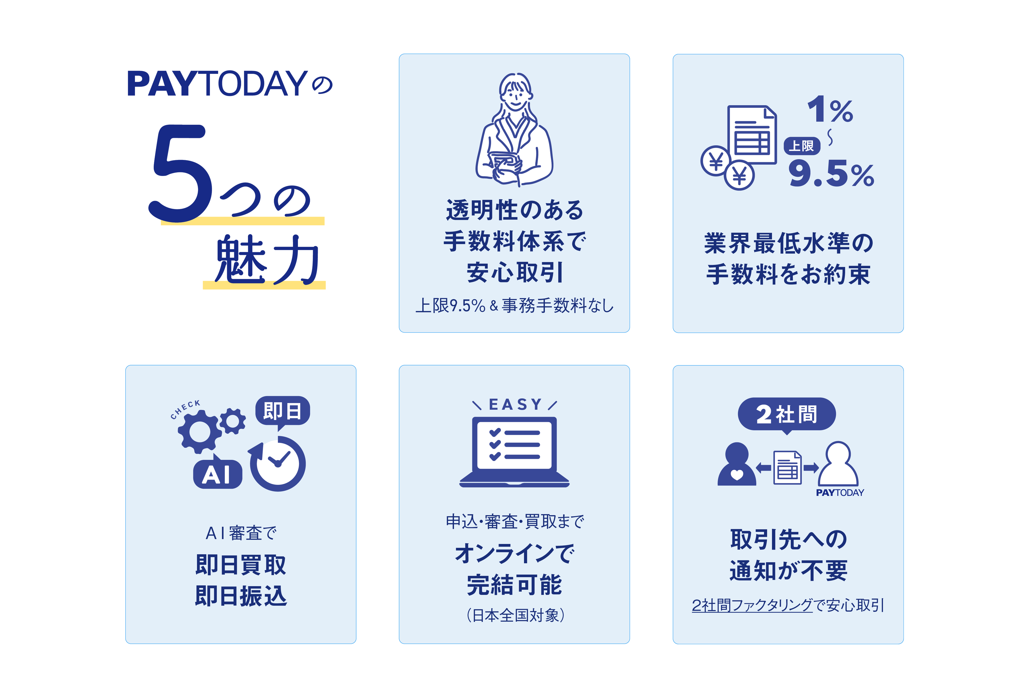 さらに、“前向きな資金調達を行う“という理念ゆえ、大きな受注をとるために前払いの資金が早急に必要になったベンチャー企業や、事業収入の判断基準となる確定申告をまだ行っていない1年目のフリーランスであっても、事業内容に将来性があると判断されれば、サービスを受けることができることができます。フリーランスやスタートアップ、中小企業の方々等、これまで資金調達という手段を持たなかった方々が『PAYTODAY』を資金調達の有効な手段としてご活用いただければ幸いです。