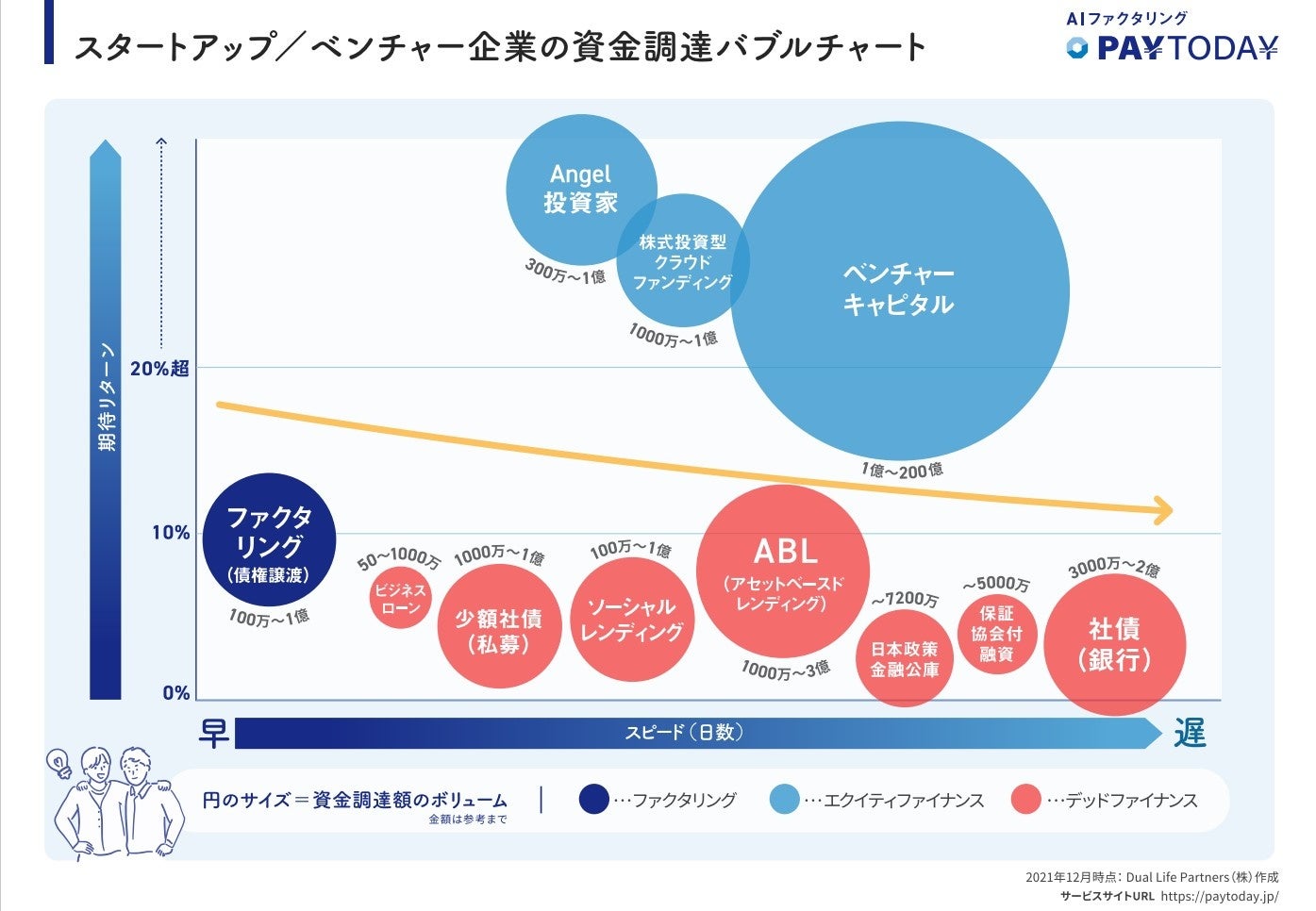 サービスを提供していく中で、スタートアップ/ベンチャー企業の資金調達の需要に出会い、特にベンチャー・スタートアップ、地方中小企業向けのサービスを強化しております。スタートアップ/ベンチャー企業のファクタリング利用に関する情報公開を行うにあたり、スタートアップ/ベンチャー企業の資金調達手法を整理する目的で「スタートアップ/ベンチャー企業の資金調達バブルチャート」を公開しております。この資金調達バブルチャートがスタートアップ/ベンチャー企業の皆様の判断の一助になればと思っております。
