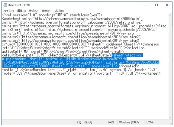 step8:<sheetProtection~>部分を削除してからzipファイル内にある元のファイルへ上書き保存します。