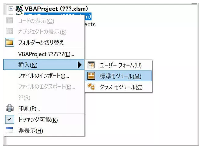 step2:事前に別で保存したエクセルファイルを右クリックして「挿入」>「標準モジュール」を選択します。