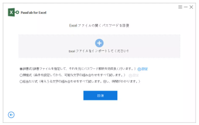 step2:パスワードを解除するエクセルファイルをインポートして、パスワード回復モードを選択後「回復」をクリックします。