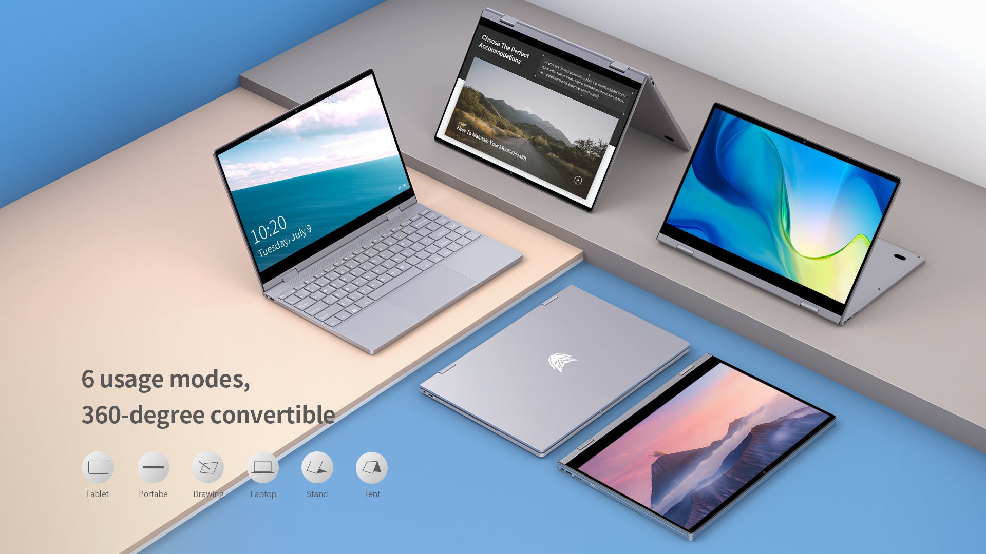 回転、折り畳み、360度の回転軸が、君の思いのままに、ノートパソコンからタブレットまでスケッチブックなど自由で多様なモード: