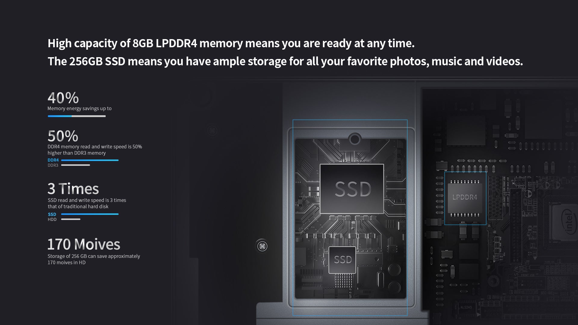 8GB RAMは主な基準テストです。言い換えると、普通の計算やゲームをハンドリングするのに十分で、深刻な速度や性能問題を起こすことはありません。そして、256GB SSDを利用して、お気に入りのいかなるコンテンツを保存することができます。