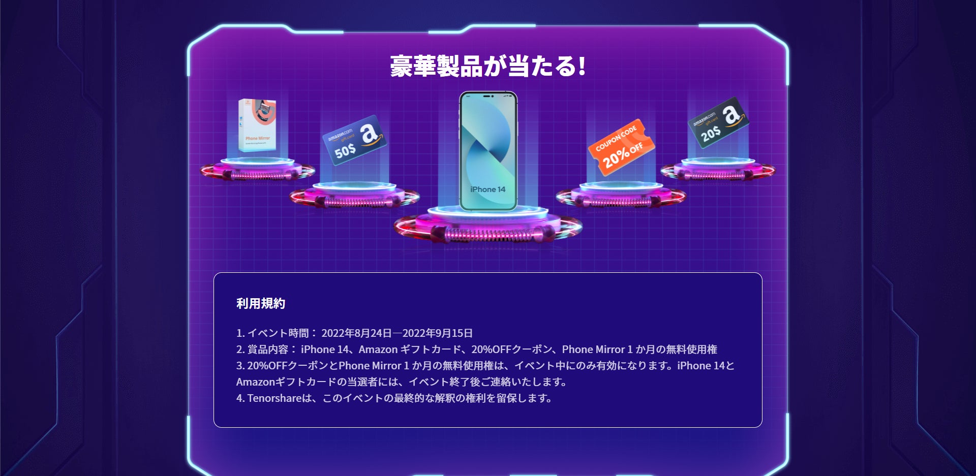 2. 20%OFFクーポンとPhone Mirror 1 か月の無料使用権は、イベント中にのみ有効になります。iPhone 14とAmazonギフトカードの当選者には、イベント終了後ご連絡いたします。