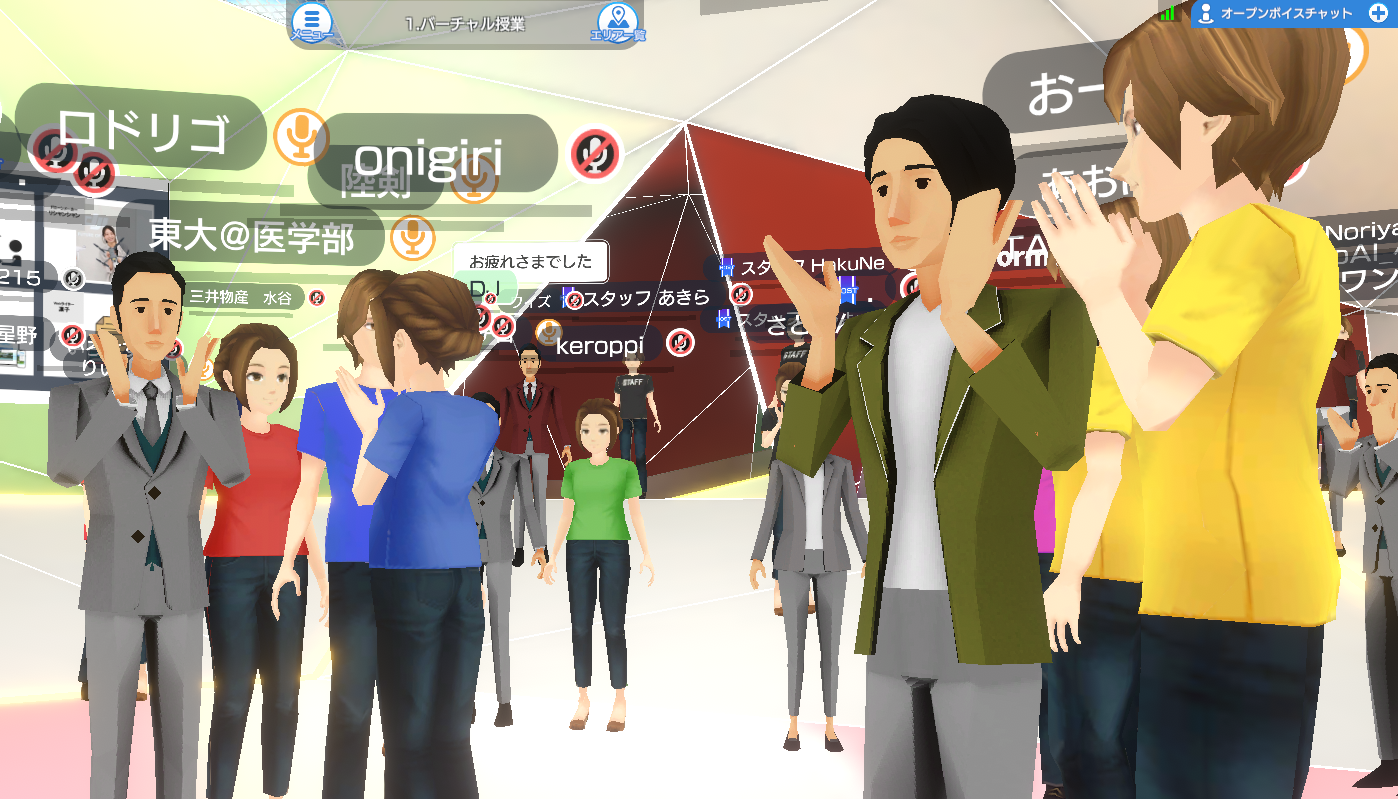 メタバース授業の最後は、全員揃ってエモート機能の『拍手』で終了しました。