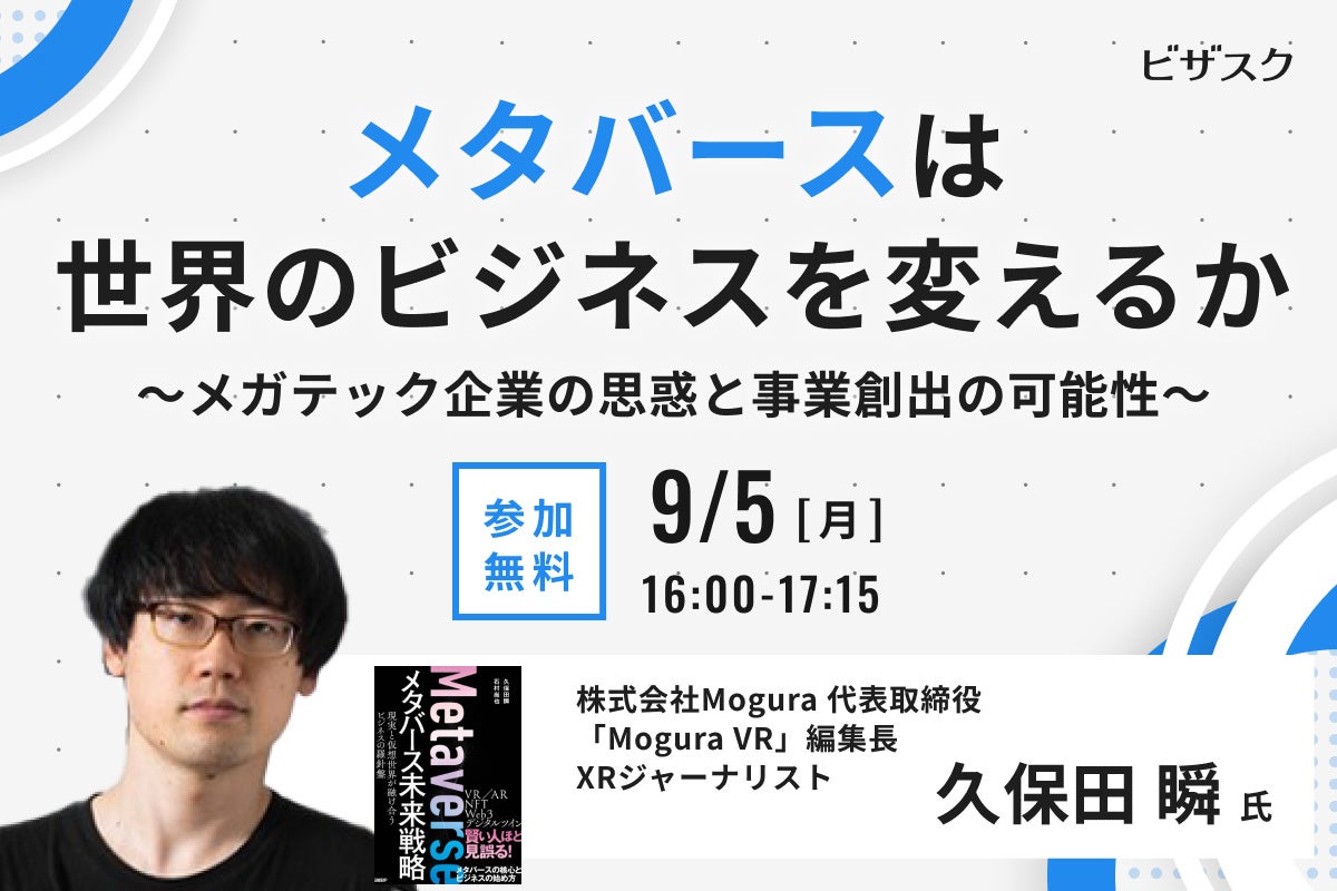 本セミナーでは、「メタバース未来戦略 現実と仮想世界が融け合うビジネスの羅針盤」(2022年6月16日発売)著者で、株式会社Mogura 代表取締役、「Mogura VR」編集長、XRジャーナリストの久保田 瞬氏をお招きします。