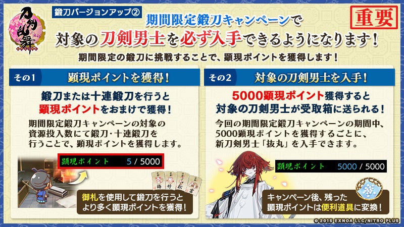 今回の新刀剣男士「抜丸」が登場する「期間限定鍛刀キャンペーン」では各資源「700」の鍛刀または十連鍛刀を行った際に「顕現ポイント」を獲得でき、期間中「5000顕現ポイント」を獲得するごとに、新刀剣男士「抜丸」が受取箱に送られます。