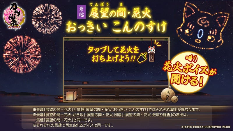 ※5つの景趣のうち、景趣「展望の間・花火 おっきい こんのすけ」のみ演出が異なりますが、再生される「花火ボイス」は同一です。